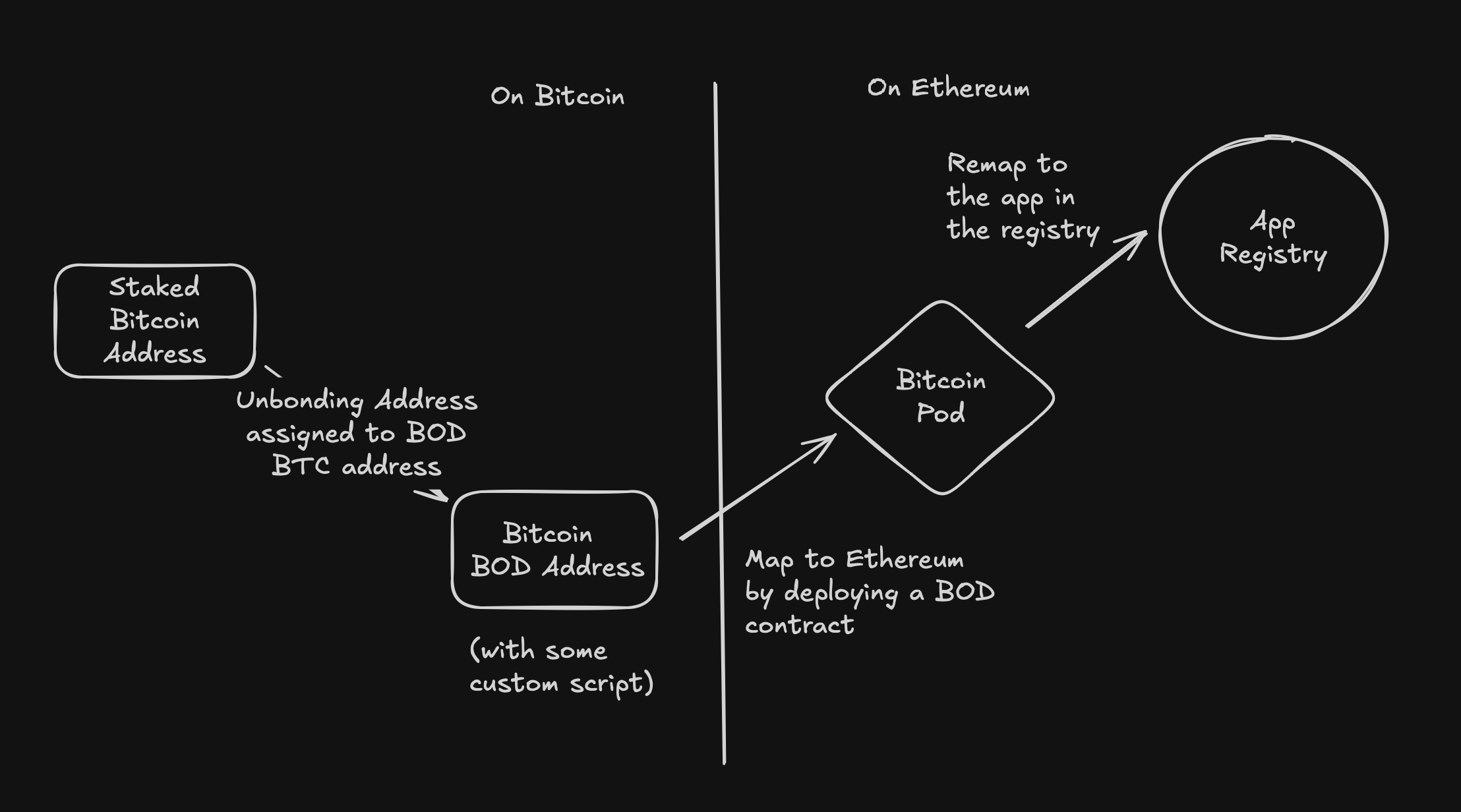 A bitcoin address mapped to a stateless BitcoinPod(BOD) serves as the withdrawal credential for a staked validator on a different protocol.